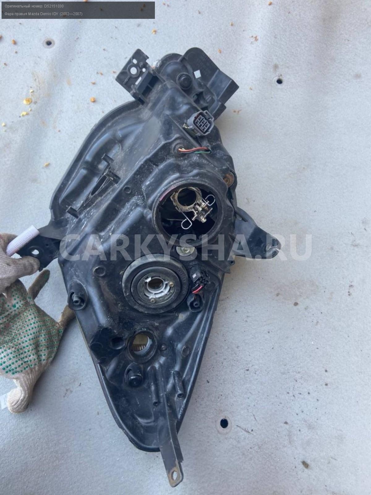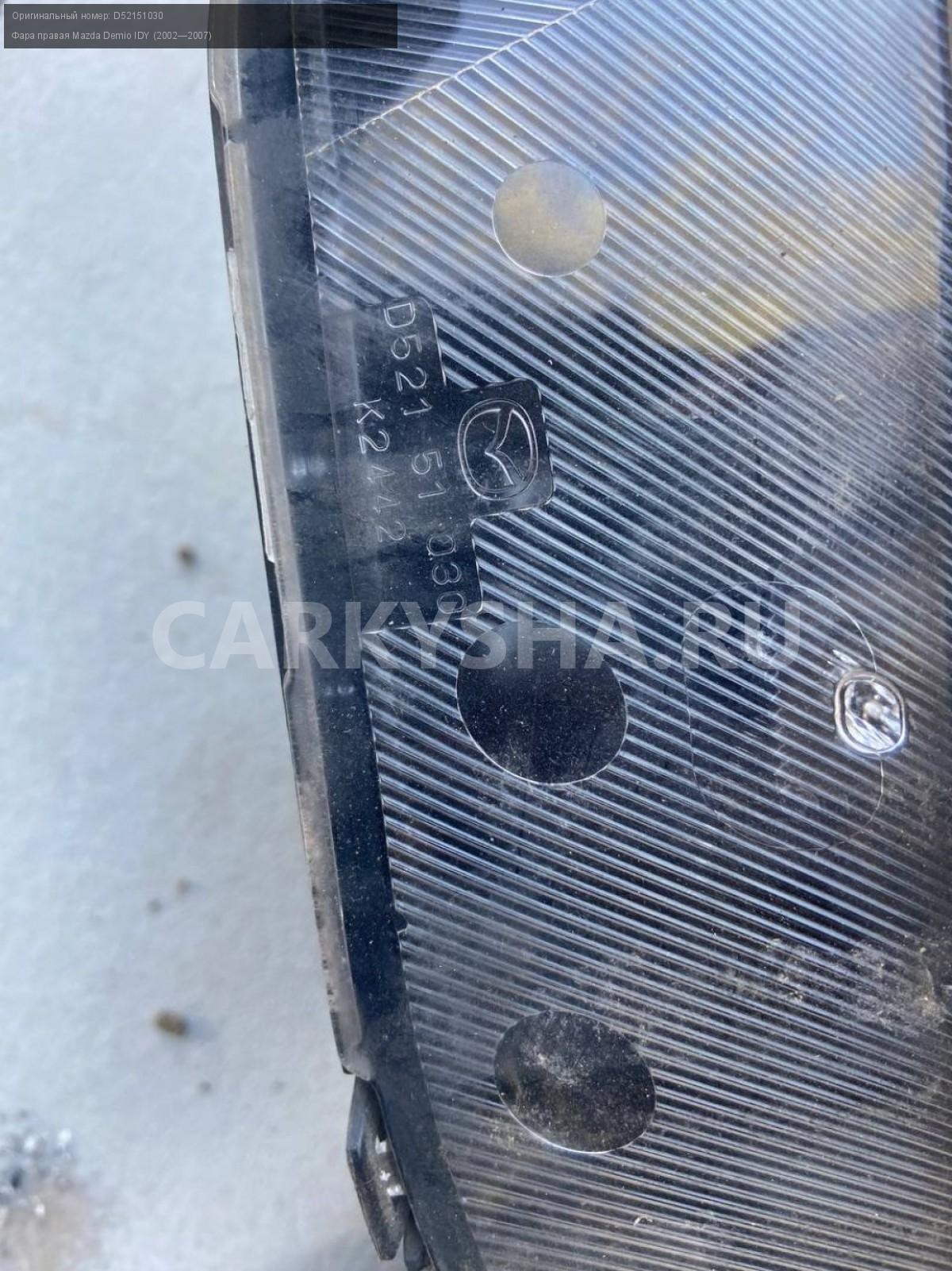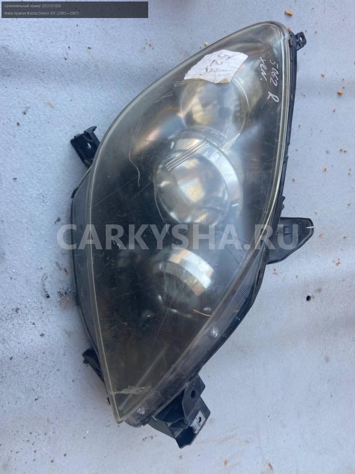 Mazda Demio DY3, фара правая ксенон.\nАртикул: 4944\n\nОриг. номер: D52151030\nПроизводитель: MAZDA\nПримечание:Мазда Демио DY3 , фара правая ксенон, бу. \n\nМарка: Mazda\nМодель: Demio IDY (2002—2007)\nГод выпуска: 2003\nКузов номер: DY3W254283\nКузов тип: Хетчбэк\nДвигатель номер: DY3\nМодель двигателя: инжектор\nОбъем: 1.4\nТопливо: Бензин\nКоробка: Автомат\nЦвет: Синий\nПраво/Лево: Право\nПеред/Зад: Перед\nСовместимости: Mazda Demio IDY (2002—2007) 1.4 AT (91 л.с.)\nСовместимость: