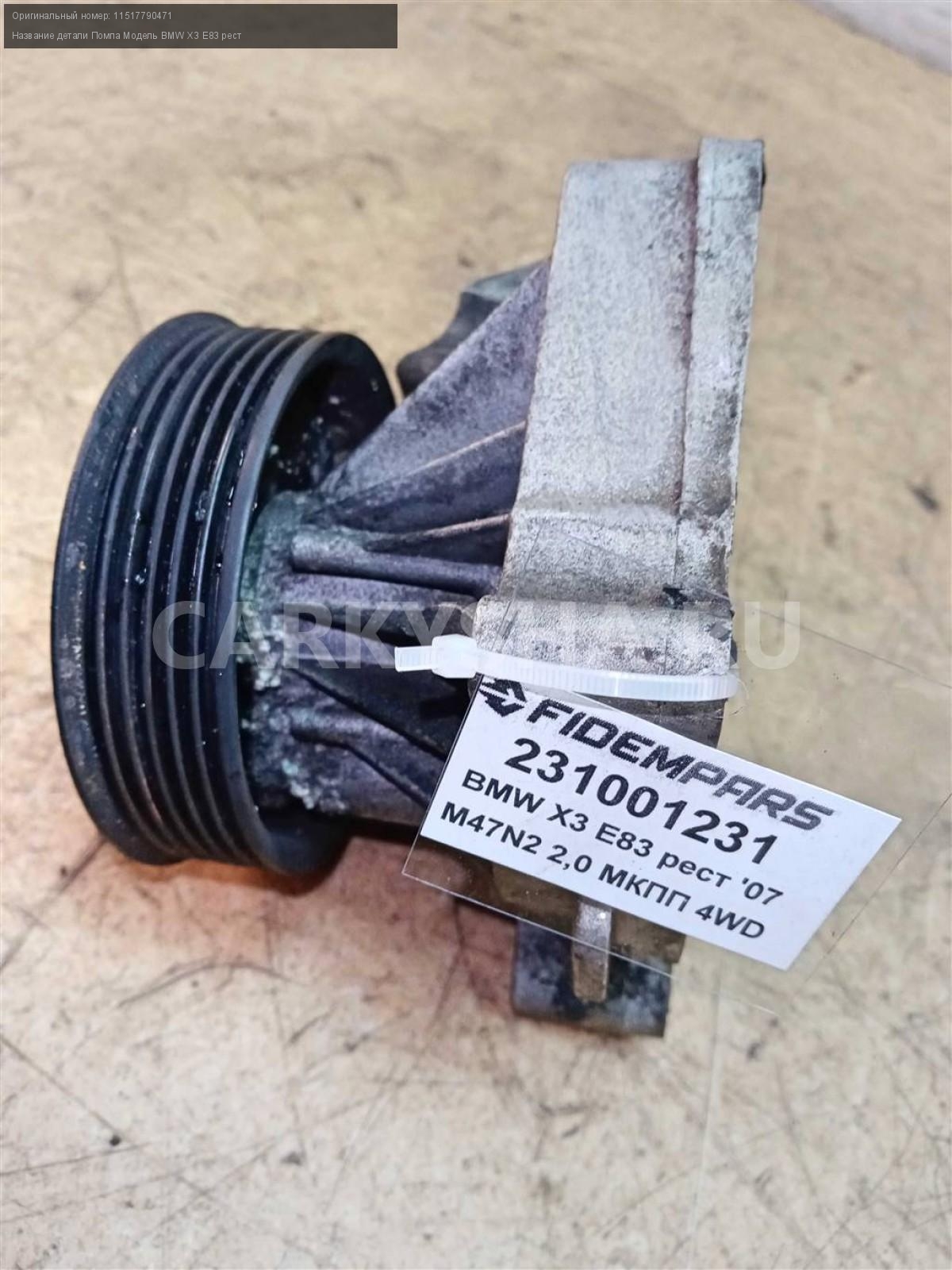 Название детали Помпа на Модель BMW X3 E83 рест Насос ОЖ. Водяной насос. 11517790471 M47N2 2.0d дизель МКПП - 6 SPEED 4WD Номер по складу:231001231 Подходит также на: BMW X3 E83 рест