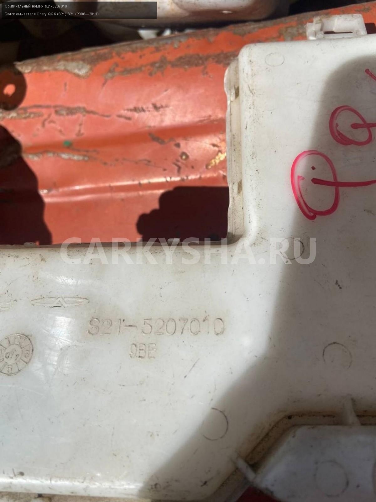 Chery QQ6, бачок омывателя.\nАртикул: 5003\n\nОриг. номер: s21-5207010\nПроизводитель: CHERY\nПримечание:Чери QQ6, бачок омывателя, б/у. \n\nМарка: Chery\nМодель: QQ6 (S21) S21 (2006—2011)\nСовместимости: Chery QQ6 (S21) S21 (2006—2011)\nСовместимость: