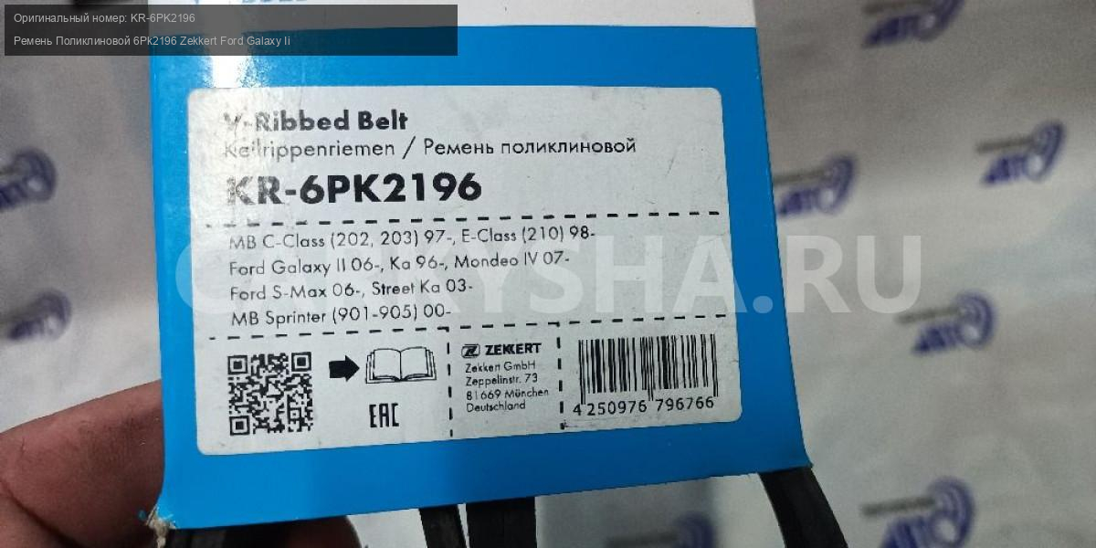 Примечание:Ремень Поликлиновой 6Pk2196 Zekkert Ford Galaxy Ii 06-, Ka 96-, Mondeo Iv 07-, S-Max 06-, Mb Sprin Zekkert арт. KR-6PK2196