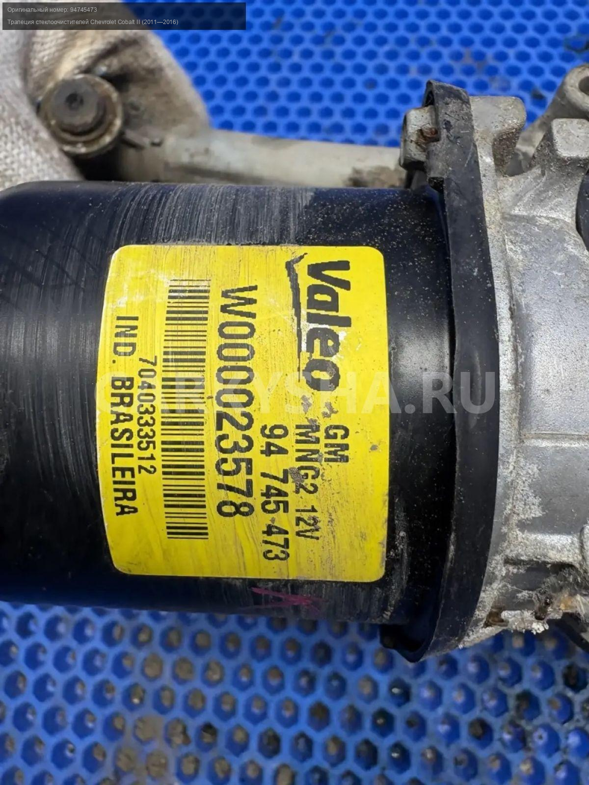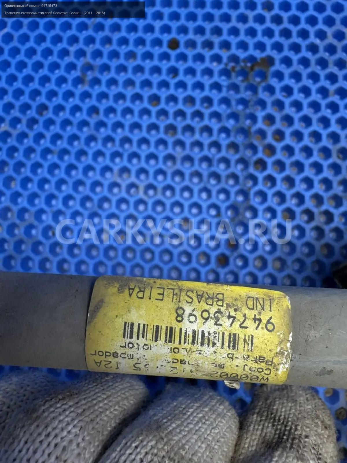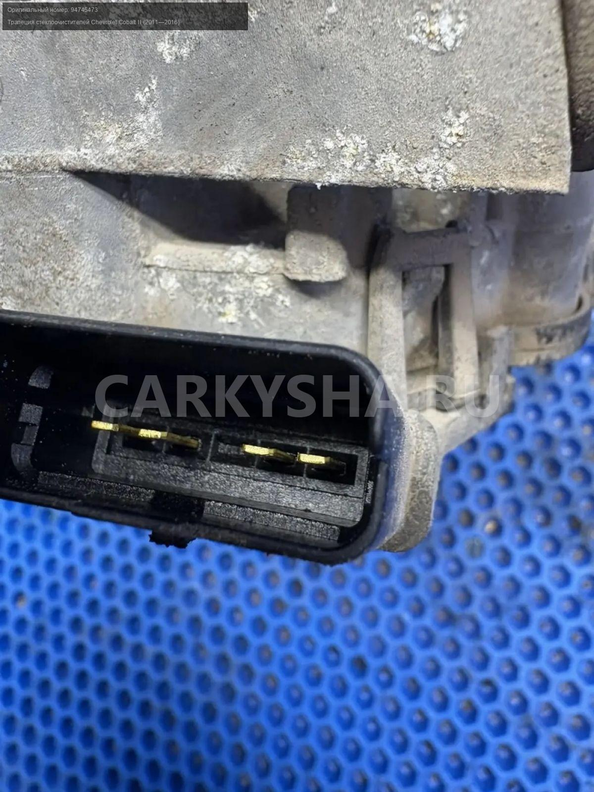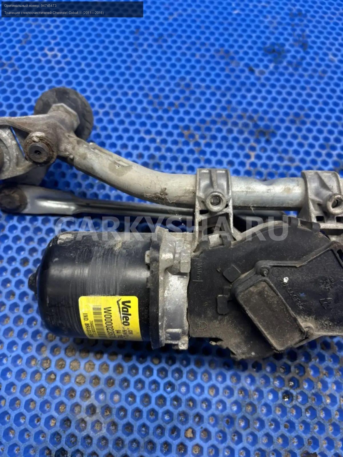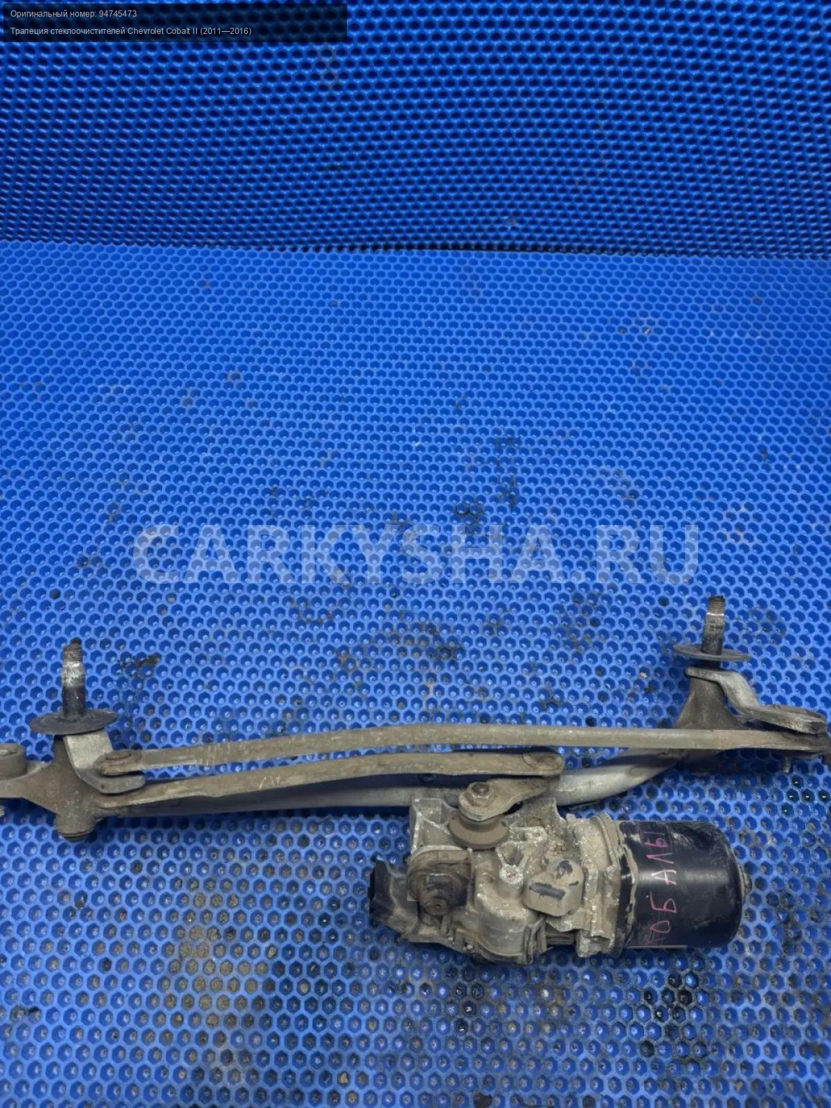 Chevrolet Cobalt, трапеция дворников с моторчиком\nАртикул: 10208\n\nОриг. номер: 94745473\nПроизводитель: CHEVROLET\nПримечание:Шевроле Кобальт, трапеция стеклоочистителя с моторчиком в сборе, б/у. \n\nМарка: Chevrolet\nМодель: Cobalt II (2011—2016)\nКузов тип: Седан\nДвигатель номер: B15D2\nМодель двигателя: инжектор\nОбъем: 1.5\nТопливо: Бензин\nКоробка: Механика\nЦвет: Серебристый\nСовместимости: Chevrolet Cobalt II (2011—2016) 1.5 MT (105 л.с.)\nСовместимость: