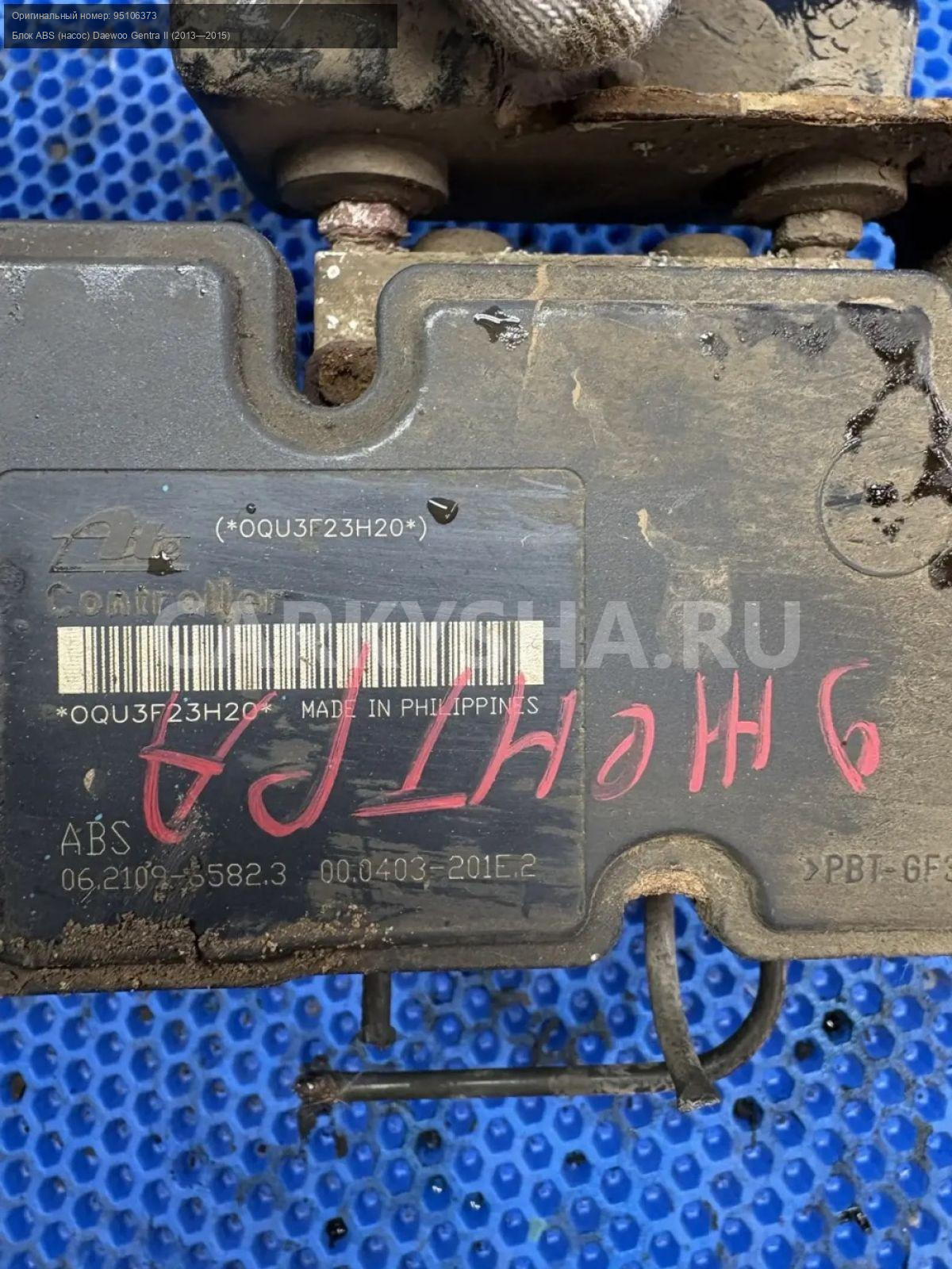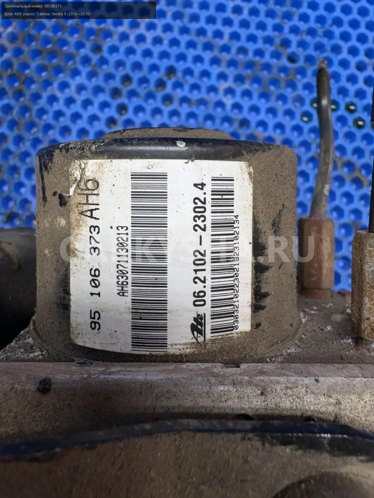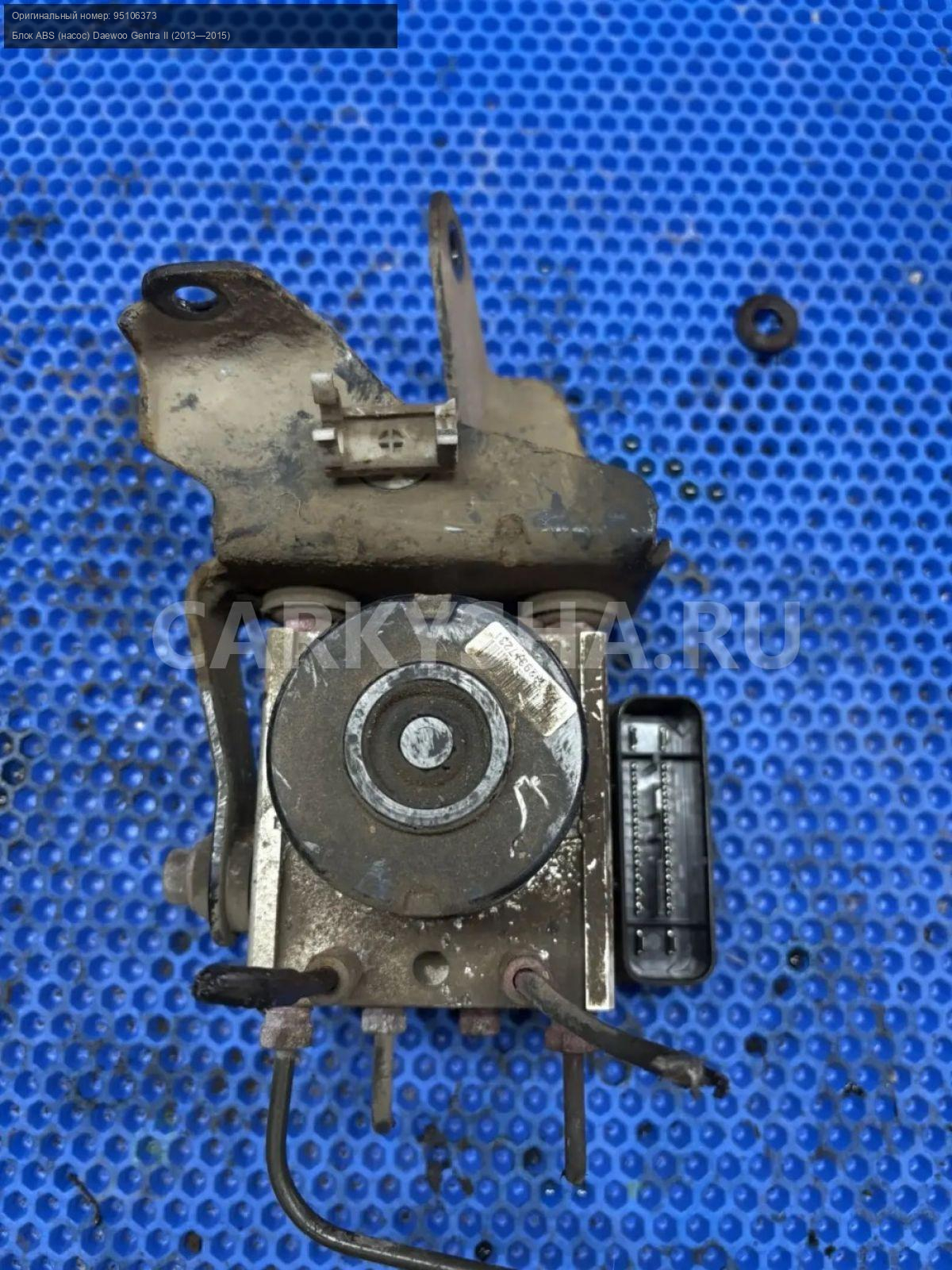 Daewoo Gentra, блок ABS\nАртикул: 10216\n\nОриг. номер: 95106373\nПроизводитель: DAEWOO\nПримечание:Дэу Джентра, блок АБС, б/у. \n\nМарка: Daewoo\nМодель: Gentra II (2013—2015)\nГод выпуска: 2013\nКузов тип: Седан\nДвигатель номер: B15D2\nМодель двигателя: инжектор\nОбъем: 1.5\nТопливо: Бензин\nКоробка: Механика\nЦвет: Голубой\nСовместимости: Daewoo Gentra II (2013—2015) 1.5 MT (107 л.с.)\nСовместимость: