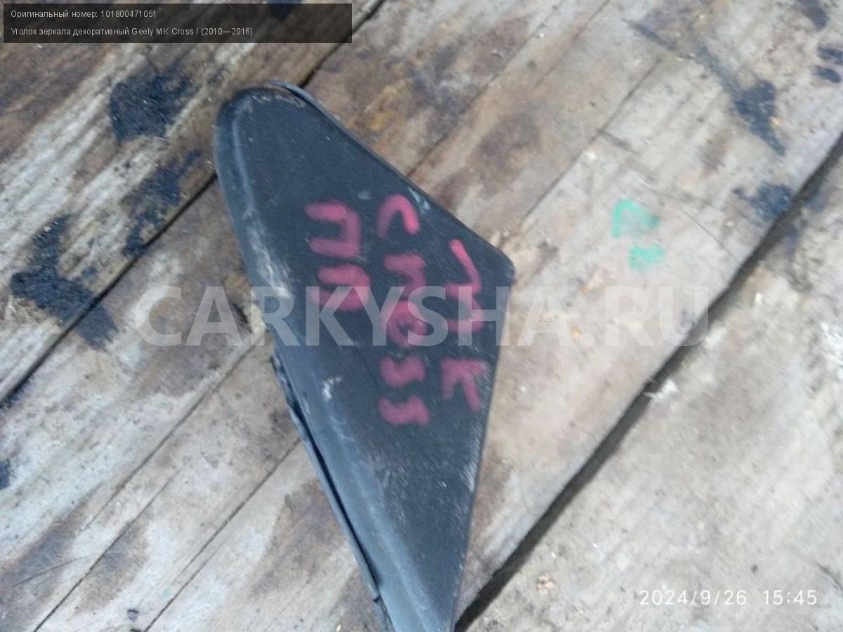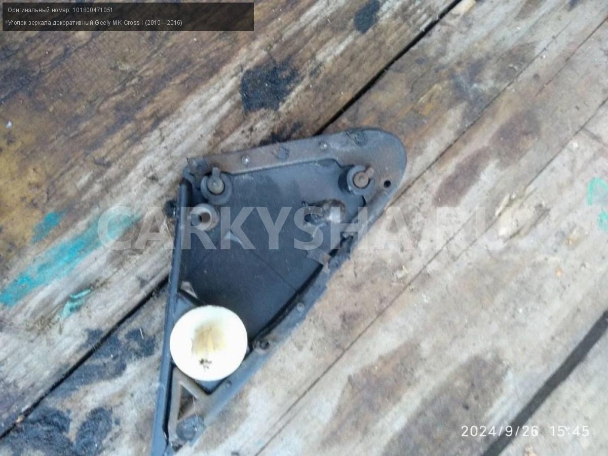 Geely MK Cross, Уголок зеркала правый.\nАртикул: 5787\n\nОриг. номер: 101800471051\nПроизводитель: GEELY\nПримечание:Джили МК Кросс , Уголок зеркала правый, б/у. \n\nМарка: Geely\nМодель: MK Cross I (2010—2016)\nГод выпуска: 2012\nКузов тип: Хетчбэк\nМодель двигателя: инжектор\nОбъем: 1.5\nТопливо: Бензин\nКоробка: Механика\nПраво/Лево: Право\nСовместимости: Geely MK Cross I (2010—2016) 1.5 MT (94 л.с.)\nСовместимость: