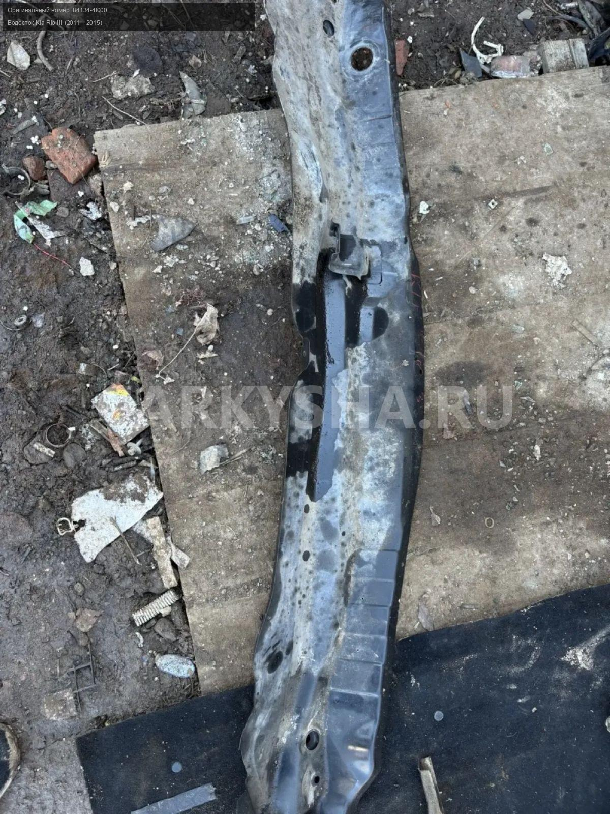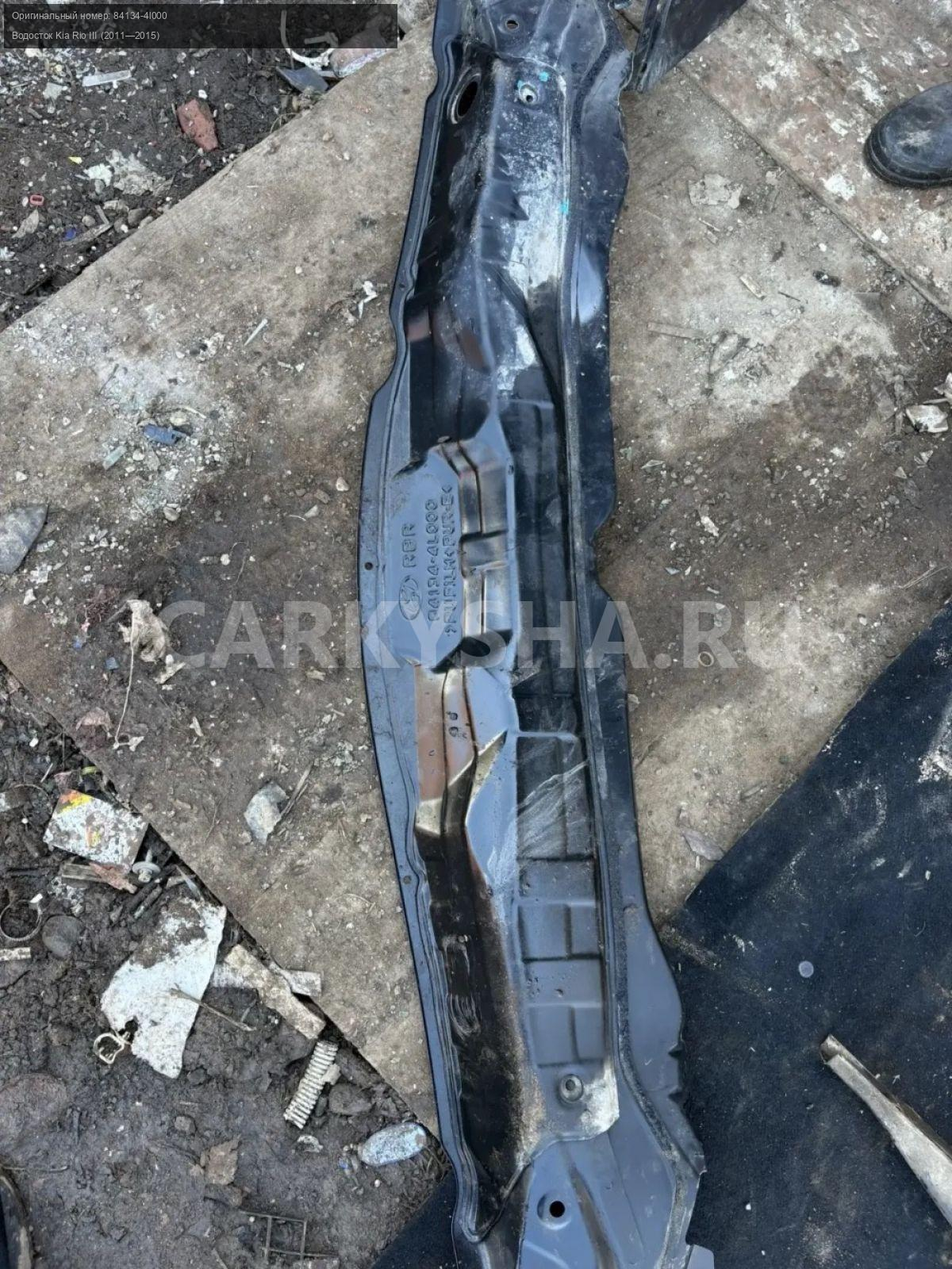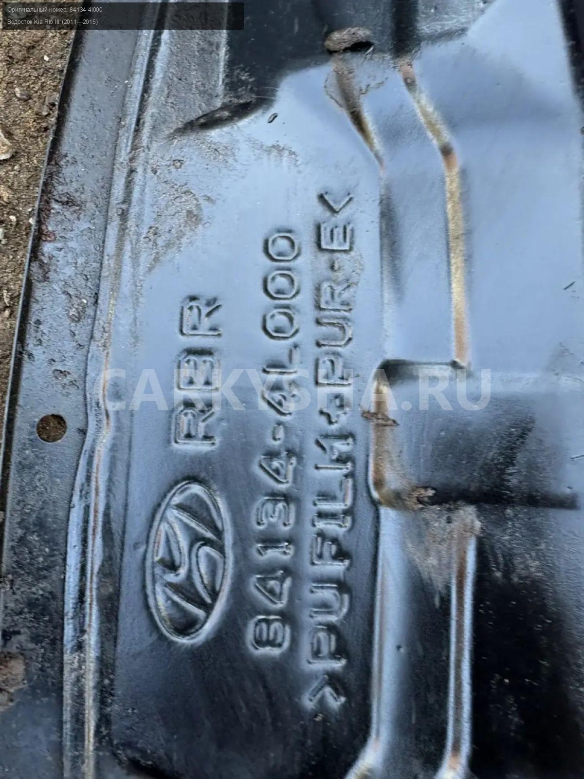 Kia Rio III, водосток.\nАртикул: 10223\n\nОриг. номер: 84134-4l000\nПроизводитель: Hyundai-KIA\nПримечание:Киа Рио 3 , водосток , б/у. \n\nМарка: Kia\nМодель: Rio III (2011—2015)\nГод выпуска: 2012\nКузов тип: Седан\nДвигатель номер: G4FA\nМодель двигателя: инжектор\nОбъем: 1.4\nТопливо: Бензин\nКоробка: Механика\nЦвет: Светло-зеленый\nСовместимости: Kia Rio III (2011—2015) 1.4 MT (107 л.с.)\nСовместимость: