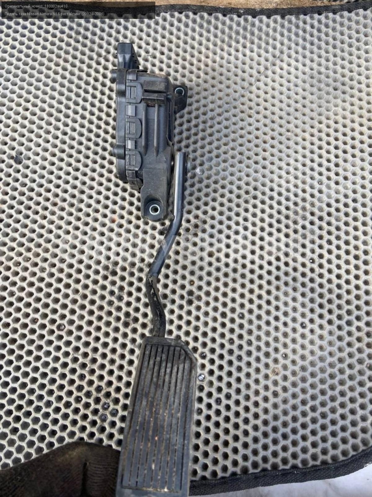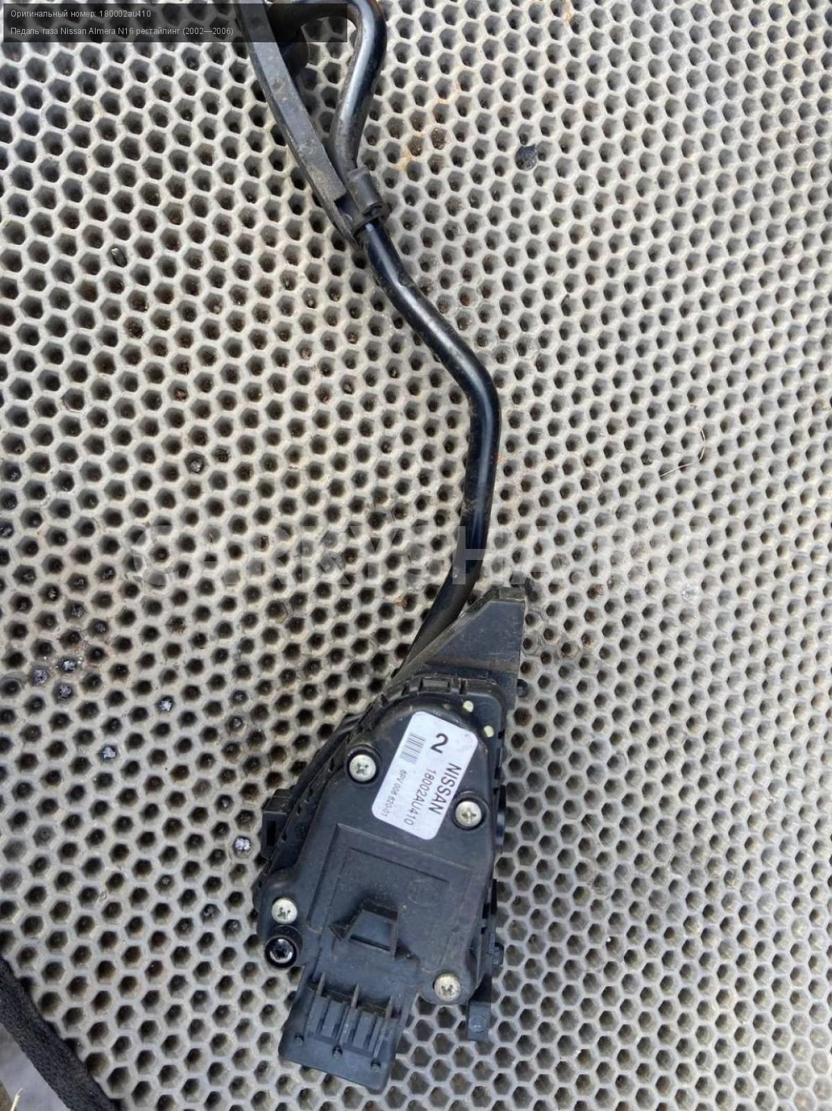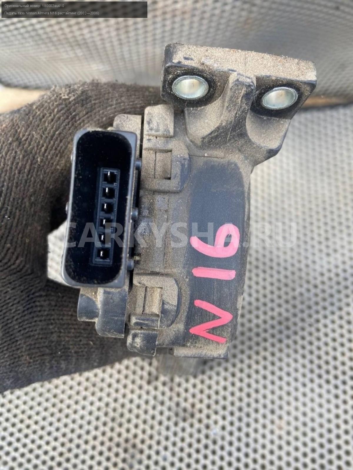 Nissan Almera N16, Педаль газа.\nАртикул: 7122\n\nОриг. номер: 180002au410\nПроизводитель: NISSAN\nПримечание:Ниссан Альмера N16, педаль газа, б/у. \n\nМарка: Nissan\nМодель: Almera N16 рестайлинг (2002—2006)\nГод выпуска: 2004\nКузов тип: Хетчбэк\nДвигатель номер: QG18DE\nМодель двигателя: инжектор\nОбъем: 1.8\nТопливо: Бензин\nКоробка: Механика\nЦвет: Черный\nСовместимости: Nissan Almera N16 рестайлинг (2002—2006) 1.8 MT (116 л.с.)\nСовместимость: