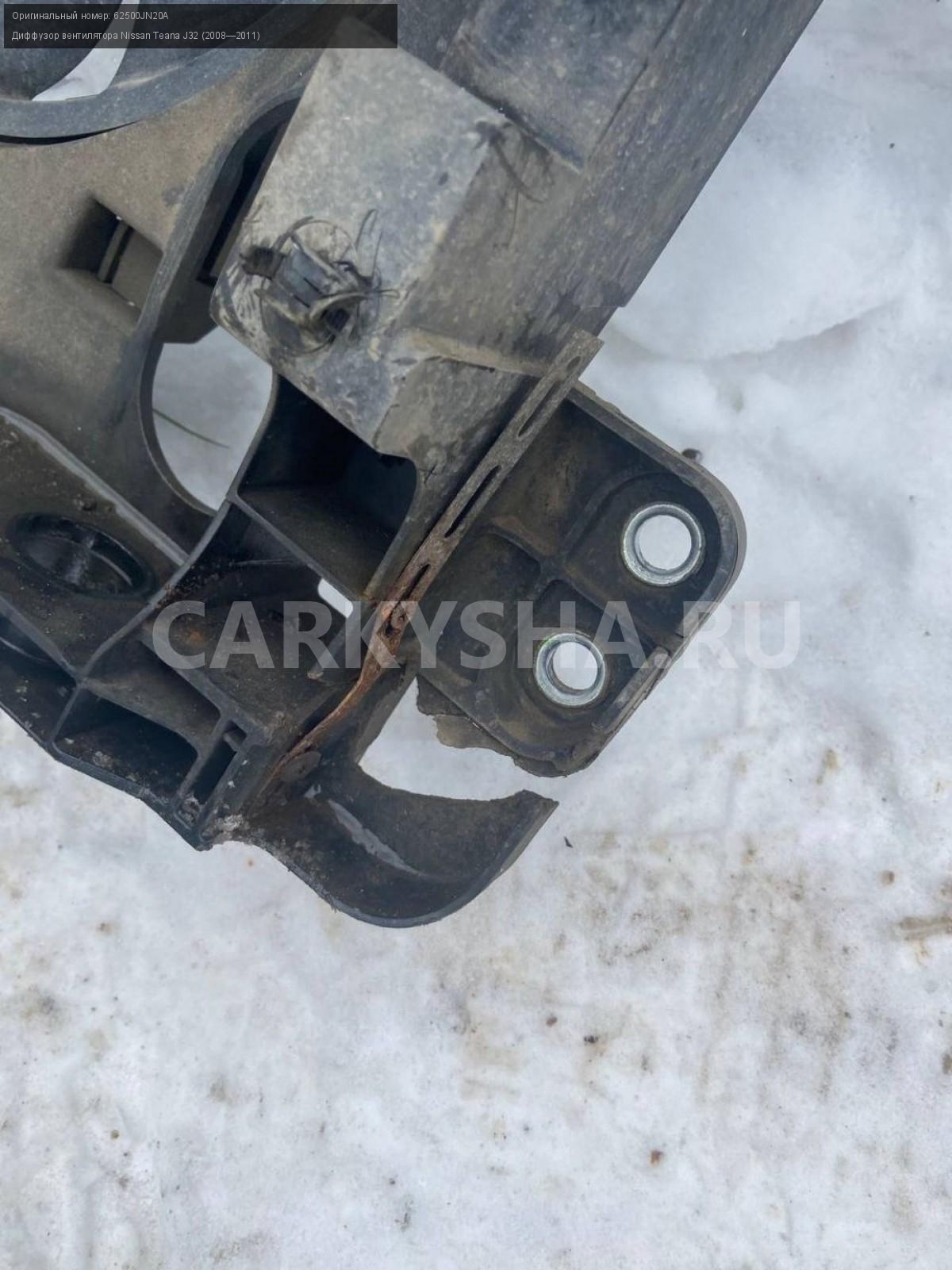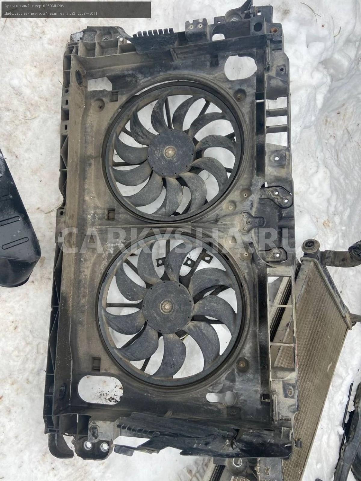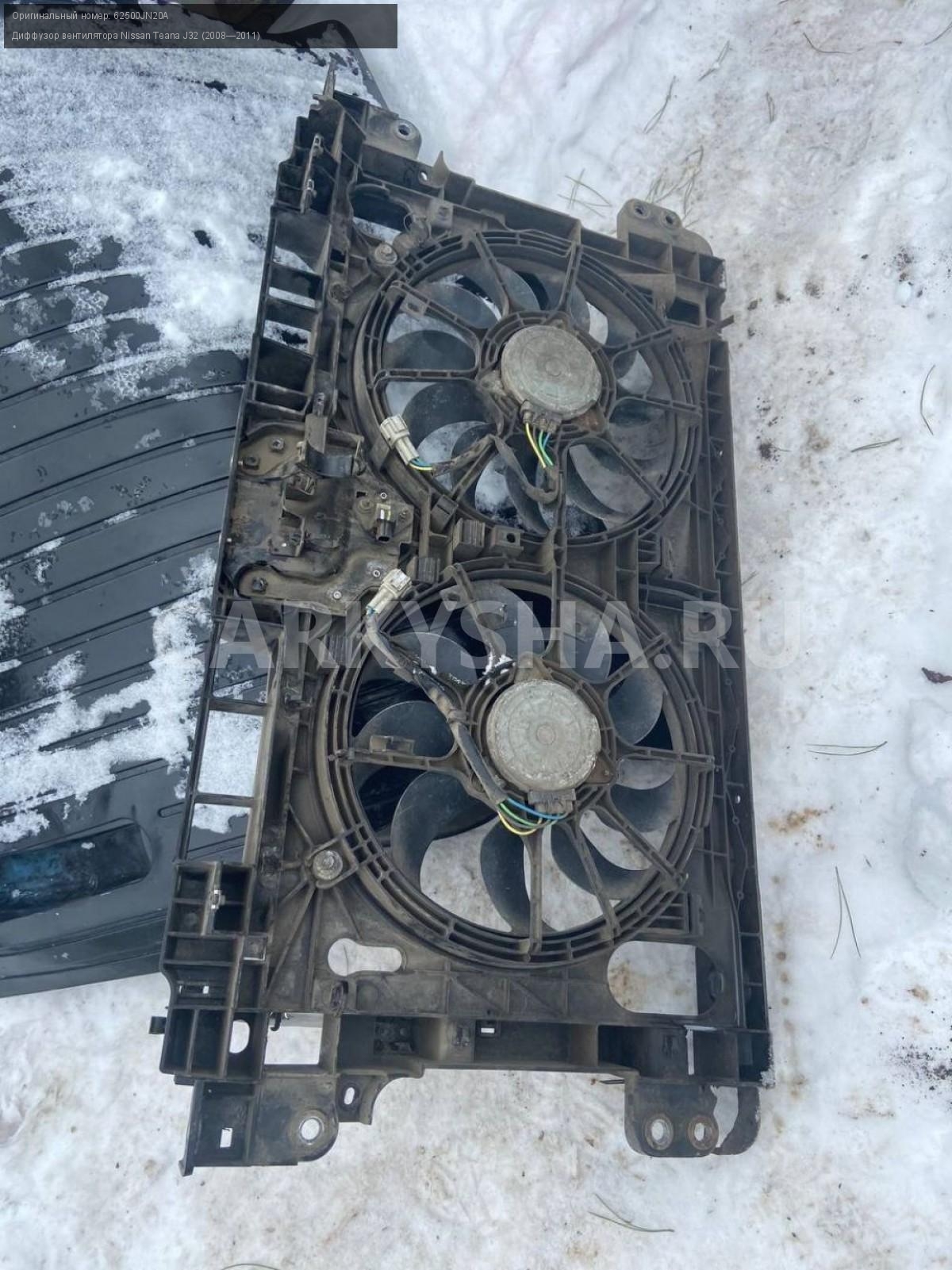 Nissan Teana J32 3.5 vq35 диффузор с вентиляторами\nАртикул: 6995\n\nОриг. номер: 62500JN20A\nПроизводитель: NISSAN\nПримечание:Ниссан Тиана J32 , 3.5 vq35, диффузор с вентиляторами, (дефект на фото), б/у. \n\nМарка: Nissan\nМодель: Teana J32 (2008—2011)\nГод выпуска: 2010\nКузов тип: Седан\nДвигатель номер: VQ35DE\nМодель двигателя: инжектор\nОбъем: 3.5\nТопливо: Бензин\nКоробка: Вариатор\nЦвет: B20-BLUEISH BLACK\nСовместимости: Nissan Teana J32 (2008—2011) 3.5 CVT (249 л.с.)\nСовместимость: