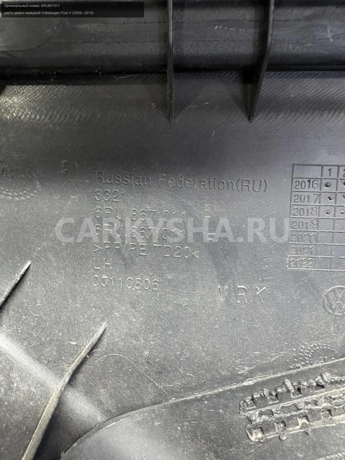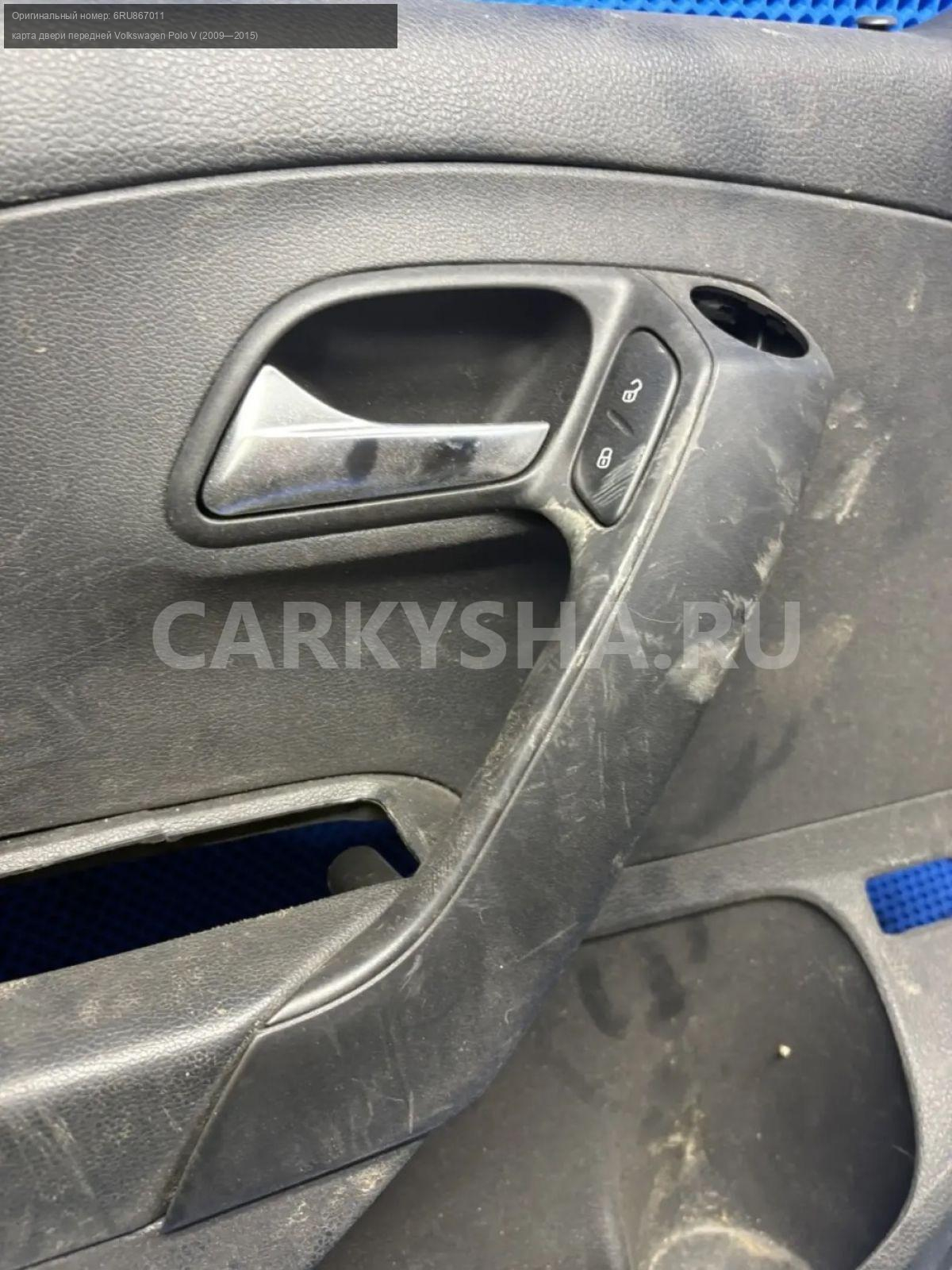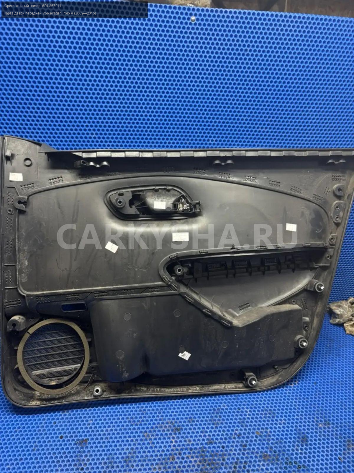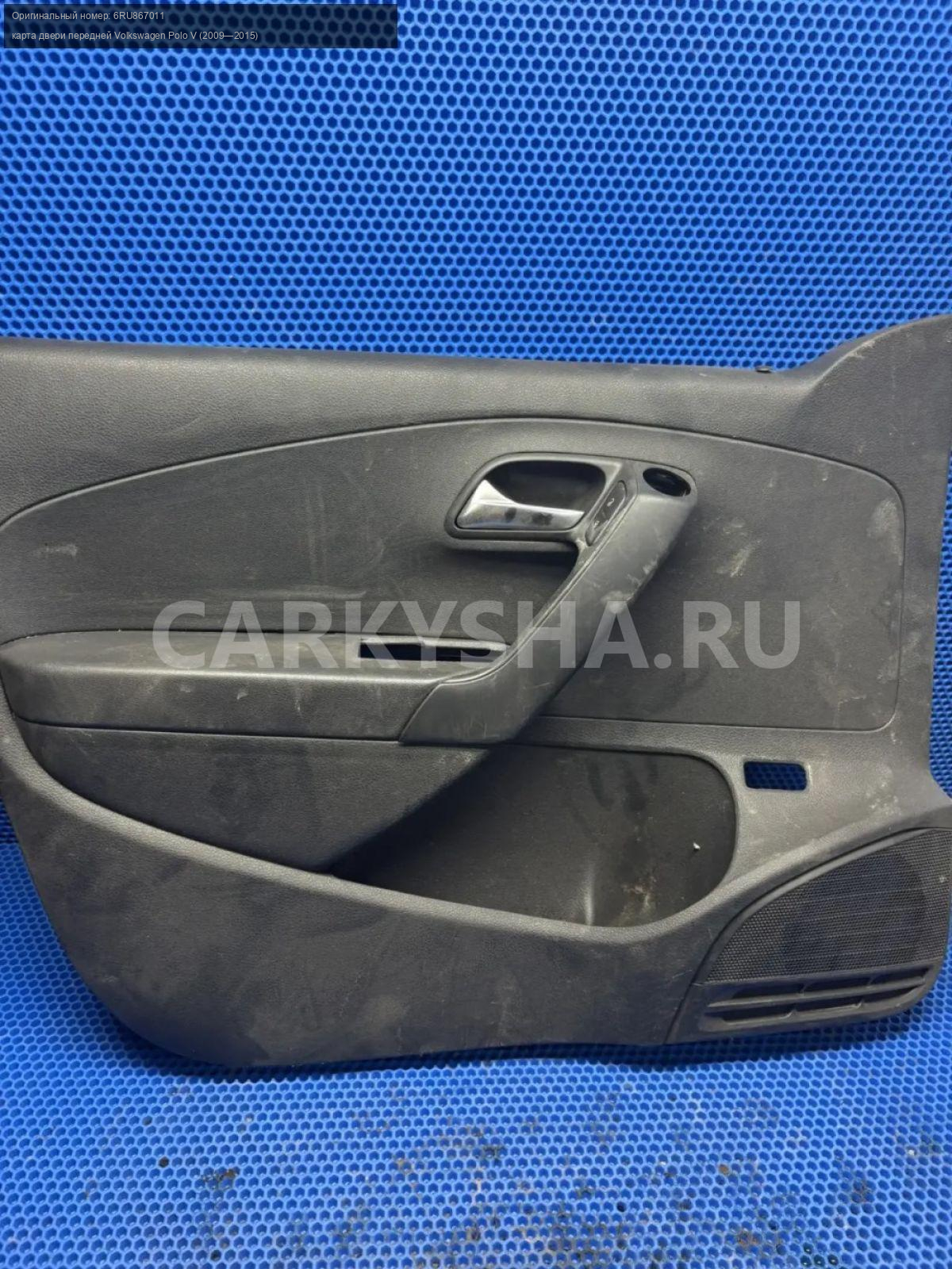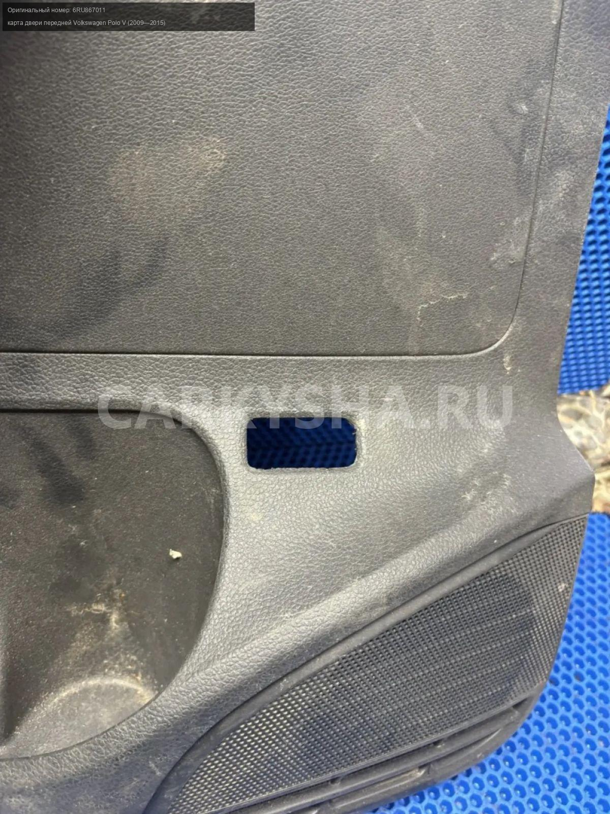 Volkswagen Polo V, обшивка двери передняя правая\nАртикул: 10253\n\nОриг. номер: 6RU867011\nПроизводитель: VAG\nПримечание:Фольцваген Поло 5, карта двери , обшивка двери передней правой , б/у. \n\nМарка: Volkswagen\nМодель: Polo V (2009—2015)\nГод выпуска: 2013\nКузов тип: Седан\nДвигатель номер: CFNA\nМодель двигателя: инжектор\nОбъем: 1.6\nТопливо: Бензин\nКоробка: Механика\nЦвет: Белый ( 0Q0Q)\nПраво/Лево: Право\nПеред/Зад: Перед\nСовместимости: Volkswagen Polo V (2009—2015) 1.6 MPI MT (105 л.с.)\nСовместимость: