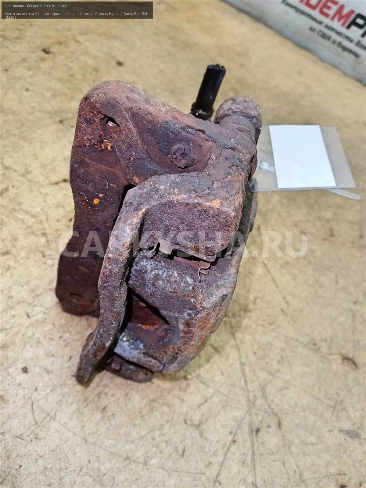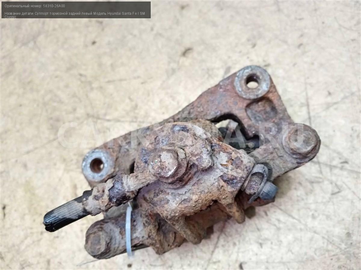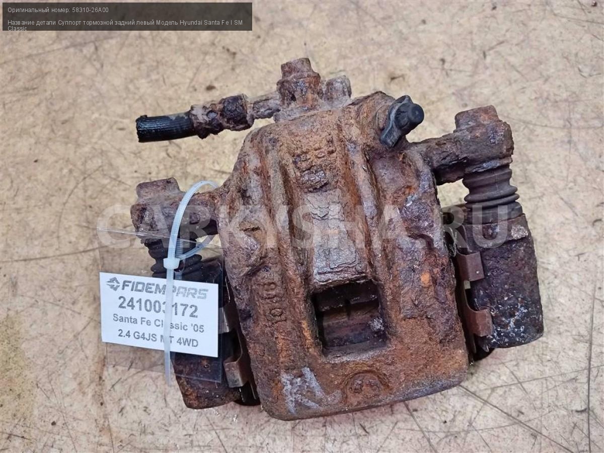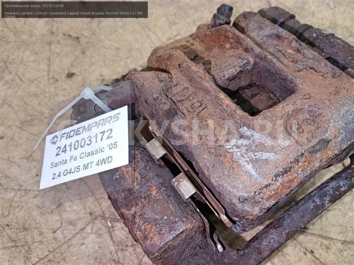 Название детали Суппорт тормозной задний левый на Модель Hyundai Santa Fe I SM Classic Поршень. Скоба. 58310-26A00 2.4 Бензин МКПП 5-ступ 4WD Номер по складу:241003172 Подходит также на: Hyundai Santa Fe I SM Classic
