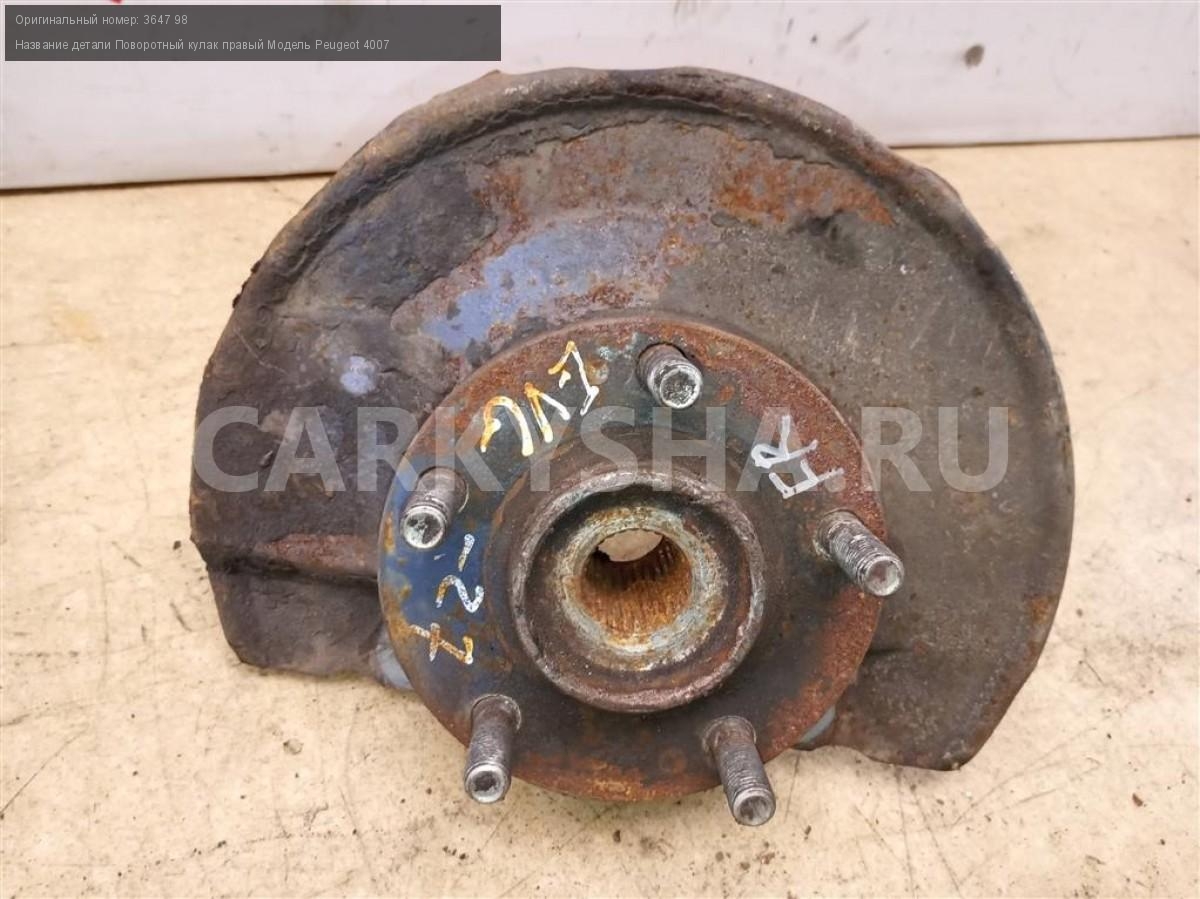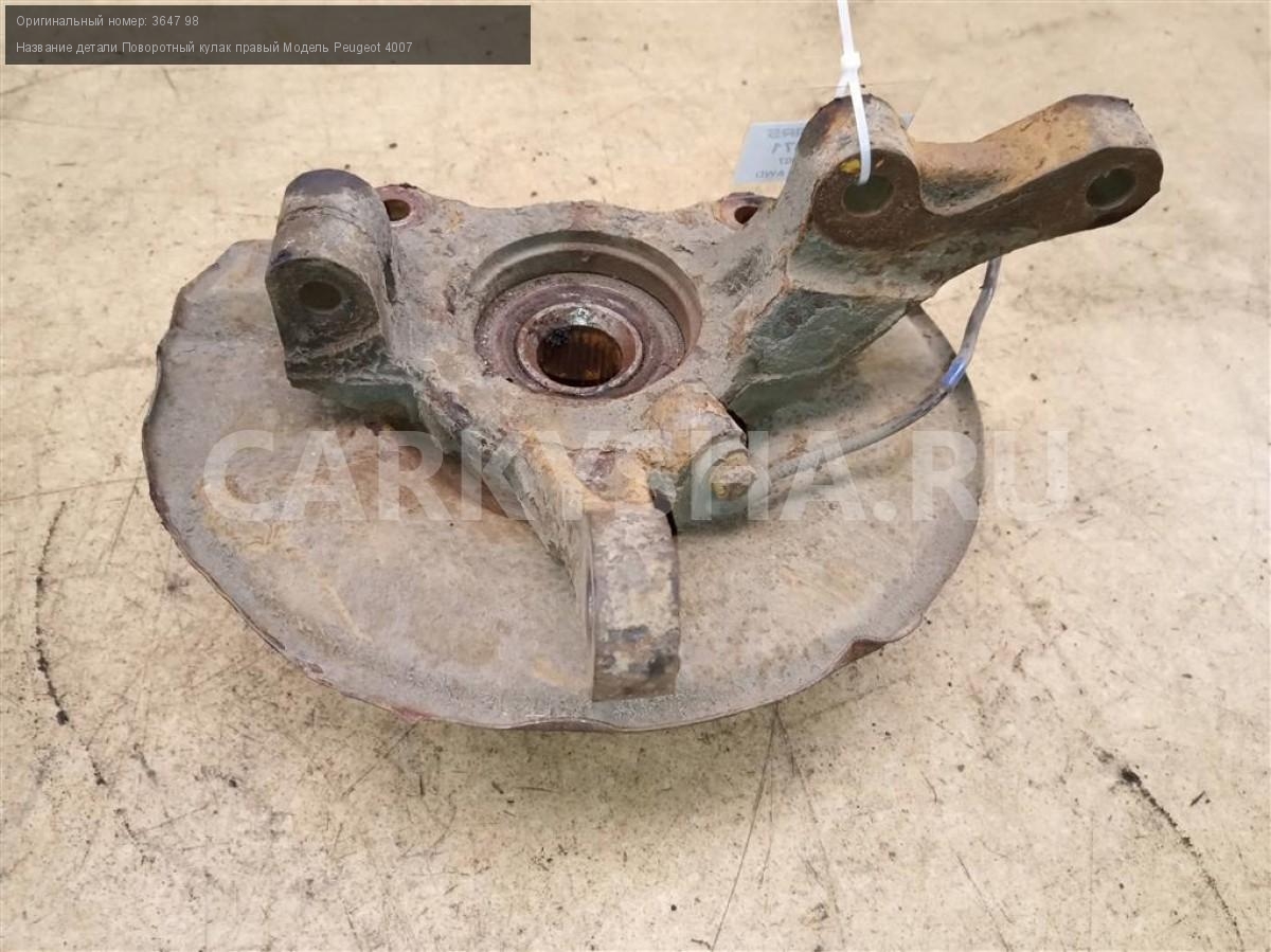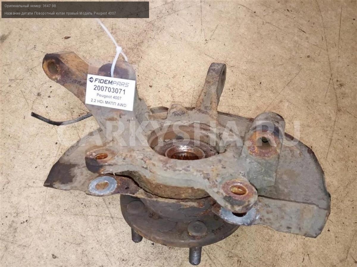 Название детали Поворотный кулак правый на Модель Peugeot 4007 В составе: ступица - 3307 91. Ступица. Цапфа. Деталь могла быть установлена на автомобили Citroen C-CROSSER, Peugeot 4007, Mitsubishi Outlander XL 3647 98 2.2 HDi 16V 4HN МКПП 4WD Номер по складу:200703071 Подходит также на: Mitsubishi Outlander XL,Peugeot 4007