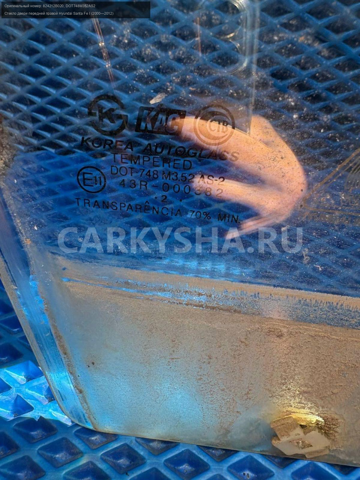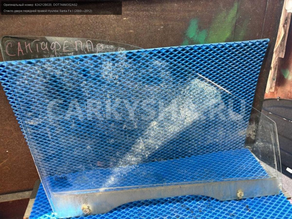Hyundai Santa Fe I Classic, стекло переднее правое\nАртикул: 8792\n\nОриг. номер: 824212B020\nНомера замен: DOT748M352AS2\nПроизводитель: Hyundai-KIA\nПримечание:Хендай Санта Фе 1 Классик, стекло двери передней правой, б/у. \n\nМарка: Hyundai\nМодель: Santa Fe I (2000—2012)\nКузов тип: Внедорожник\nДвигатель номер: G4JS\nМодель двигателя: инжектор\nОбъем: 2.4\nТопливо: Бензин\nКоробка: Механика\nЦвет: Бордовый\nПраво/Лево: Право\nПеред/Зад: Перед\nСовместимости: Hyundai Santa Fe I (2000—2012) 2.4 MT (138 л.с.)\nСовместимость: