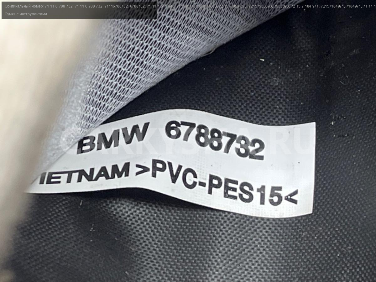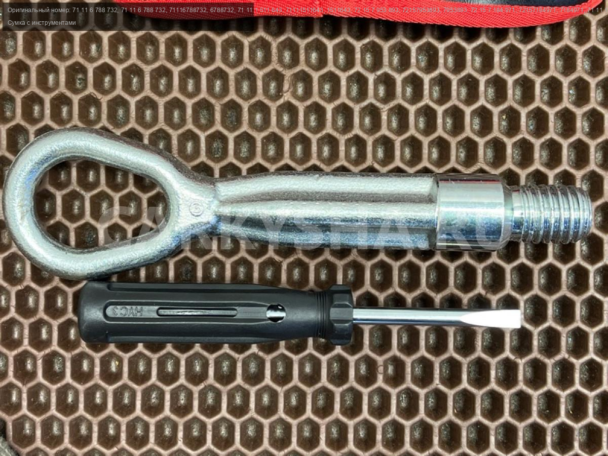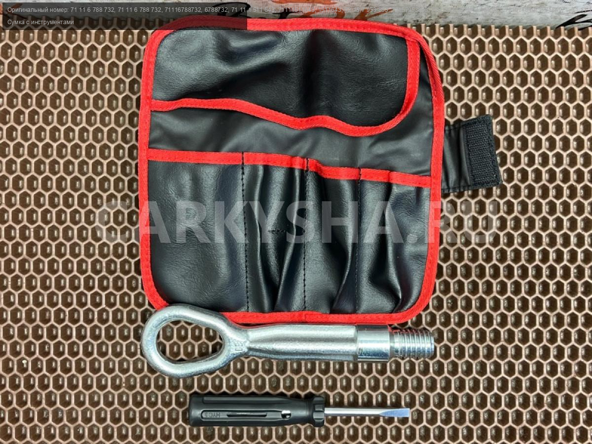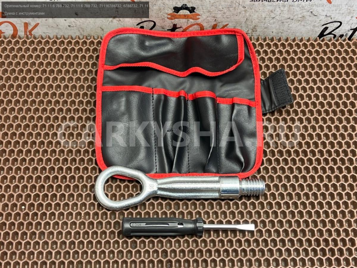 Сумка для инструментов с отверткой и буксировочным крюком проушиной БМВ ф20 ф21 ф22 ф23 ф46 ф87 ф30 ф31 ф34 ф35 ф80 ф32 ф33 ф36 ф82 ф83 ф07 ф11 ф90 г30 г31 г38 ф06 ф12 ф13 г32 г11 г12 х1 е84 х3 ф25 х4 ф26.\nСервисный комплект.\nБуксировочный крюк\n\nЗапчасть снята с японского распила BMW. \nОригинал. \nБез пробега по РФ.